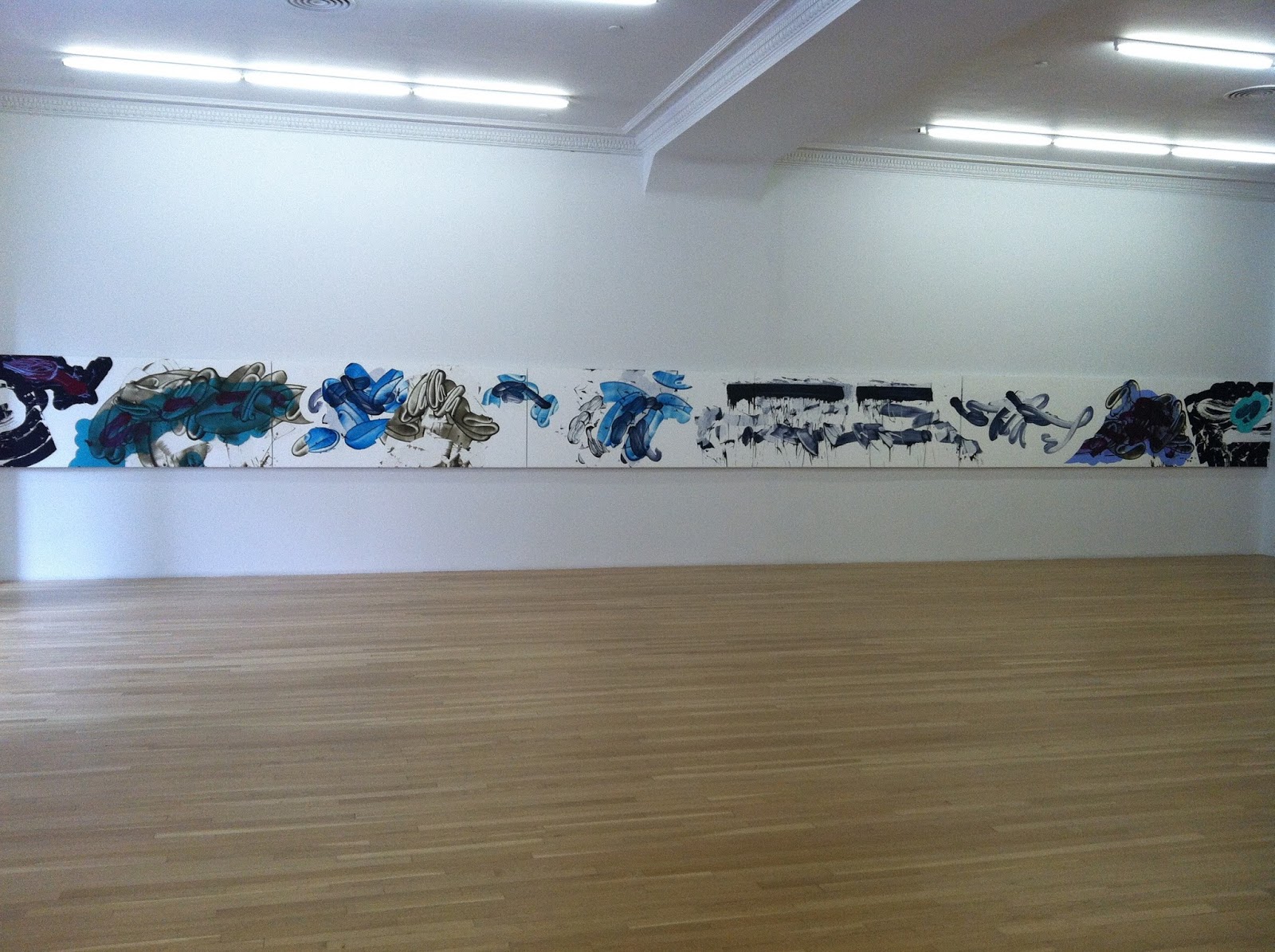 Strange spackling gestures and dry, brushy marks - texture of dryness very pleasing. Through materials, a commentary on the cheesy 1980s ethos some of us remember as children, others as young adults.