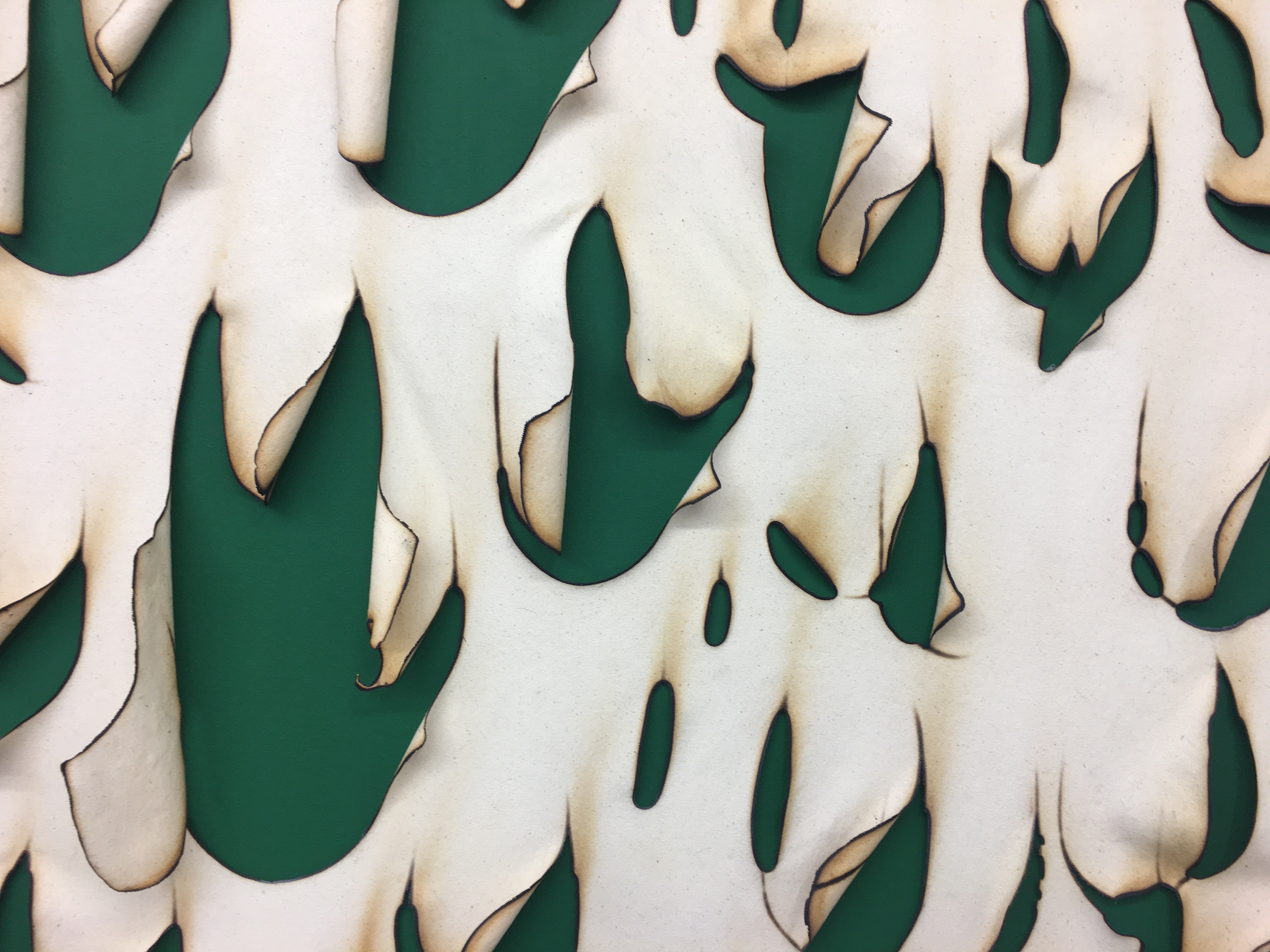"The works by Kathleen Kucka are painted with fire. She literally burns the canvas open and reveals a view of the realm beyond the surface. This realm is sometimes only light and shadow or empty space. Other times additional painted canvas is stretched behind the burn-marked surface, as to emphasize stratification, and to denote a new world behind the surface facade. There are not just protrusions created by burning the canvas, the surface is also imbued with smoke from the combustion process. The residue from this provides an additional aesthetic with round contours and a contrasting chiaroscuro. Kucka plays with the burns to create patterns that are soft and transcendent. Monumental canvases are created in which its beauty lies in the repetition of destruction."